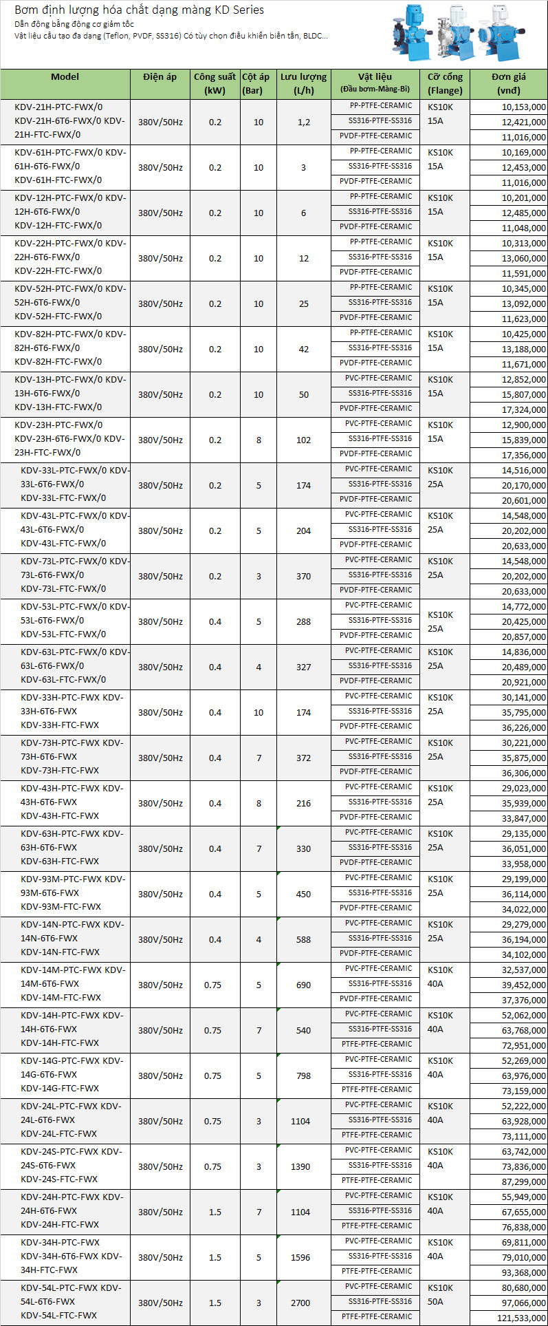 BẢNG GIÁ BƠM ĐỊNH LƯỢNG HÓA CHẤT DẠNG MÀNG CHEONSEI SERIES KDV DẪN ĐỘNG BẰNG ĐỘNG CƠ GIẢM TỐC