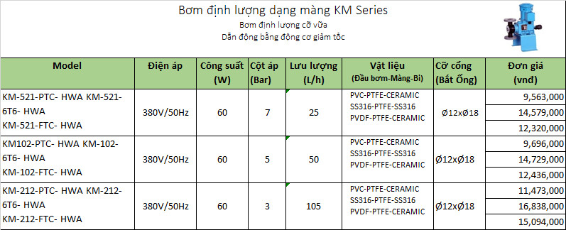 BẢNG GIÁ BƠM ĐỊNH LƯỢNG HÓA CHẤT DẠNG MÀNG CHEONSEI SERIES KM DẪN ĐỘNG BẰNG MOTOR GIẢM TỐC