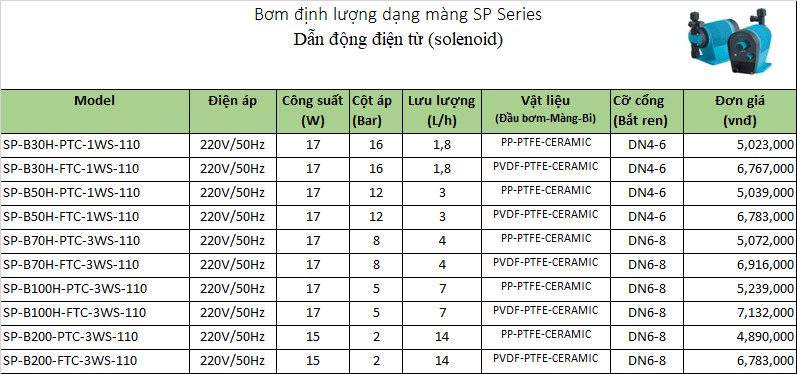 BẢNG GIÁ BƠM ĐỊNH LƯỢNG HÓA CHẤT DẠNG MÀNG CHEONSEI SERIES SP DẪN ĐỘNG ĐIỆN TỪ SOLENOID