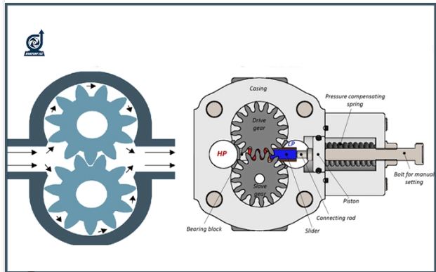 – Bánh răng nghiêng tạo hiệu suất lưu lượng cao, giảm tiếng ồn.