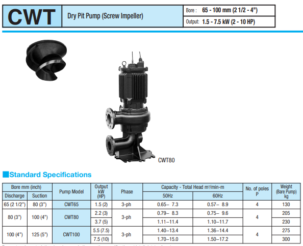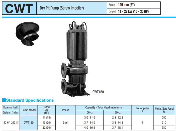 Bơm chìm đặt cạn cánh vít SHINMAYWA Model CWT150 22 kW 380 Cỡ cổng 150mm