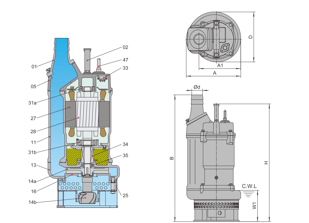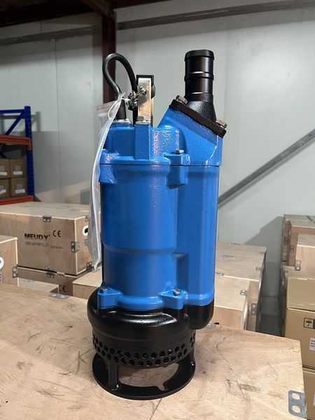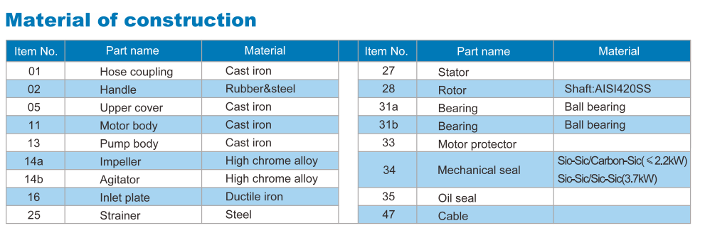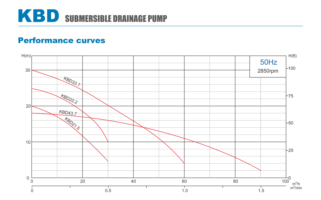 Máy bơm ly tâm thoát nước thả chìm kiểu KBD: Là dòng máy bơm bùn tải nặng có gắn cánh khuấy ở đầu trục. Thân bơm, động cơ được làm bằng Gang cứng nên có độ bên cao, Cánh bơm kiểu bán hở (Semi vortex impeller), dễ dàng cho chất huyền phù,