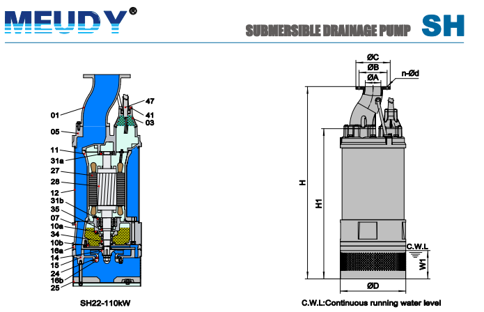 Bơm chìm Meudy là dòng bơm nước thải, bơm thoát nước, bơm bùn loãng, bùn đặc, nước thải có cặn rác, sản xuất tại Trung Quốc (China), với nhiều dòng bơm phù hợp với mục đích sử dụng, đa dạng thông số, phân phối bởi Công Ty Cổ Phần Máy Bơm Việt Nam.