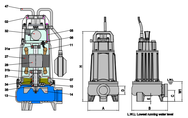 Bơm chìm Meudy là dòng bơm nước thải, bơm thoát nước, bơm bùn loãng, bùn đặc, nước thải có cặn rác, sản xuất tại Trung Quốc (China), với nhiều dòng bơm phù hợp với mục đích sử dụng, đa dạng thông số, phân phối bởi Công Ty Cổ Phần Máy Bơm Việt Nam.