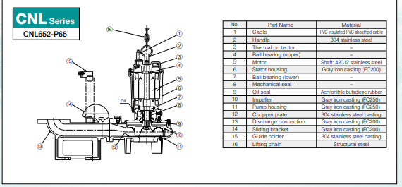 Vật liệu cấu tạo: Vỏ bơm, cánh bơm bằng gang đúc (FC250)