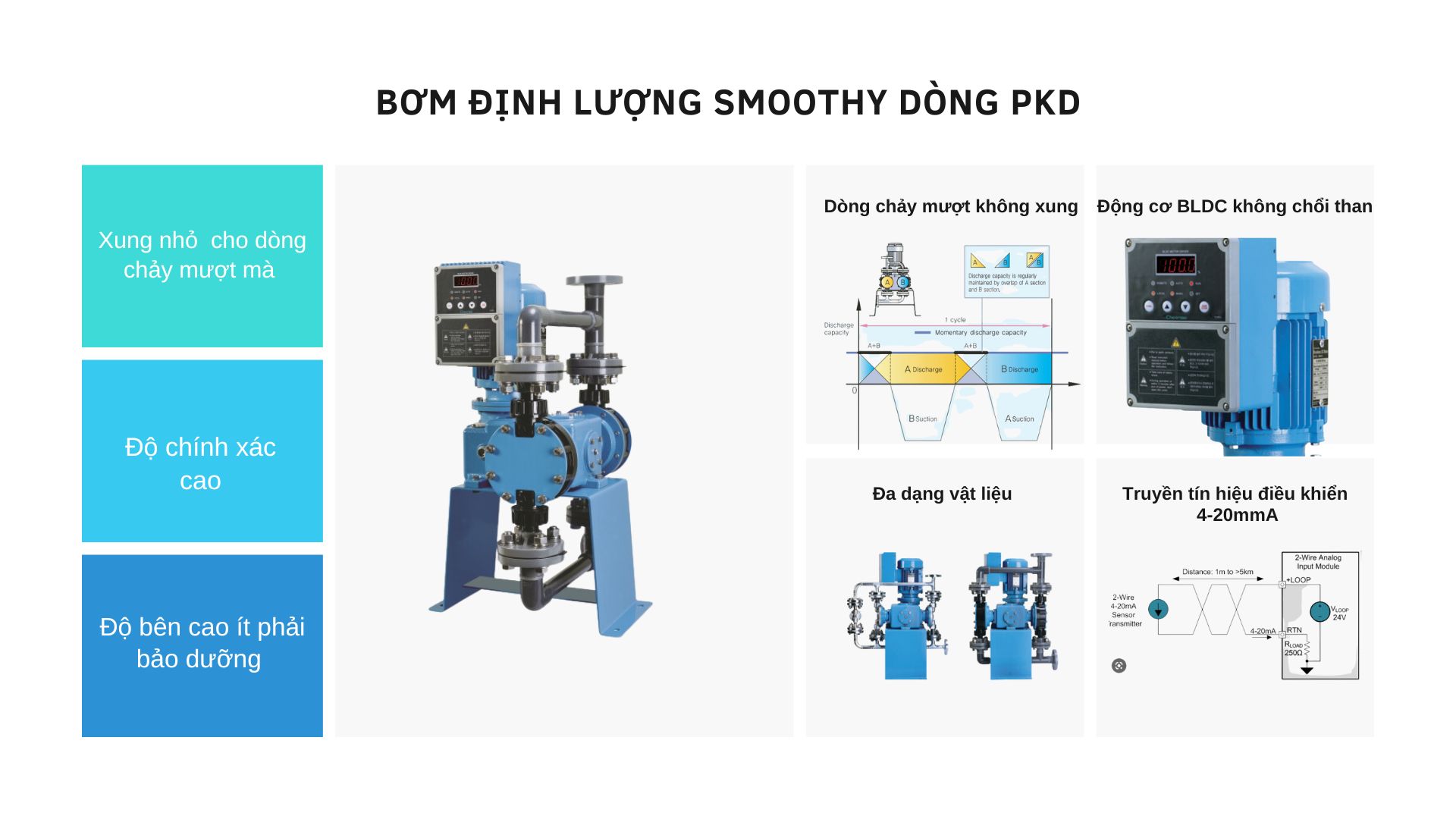 Bơm định lượng dạng màng có ưu điểm là áp suất xả cao, định lượng cố định,và chống ăn mòn, nhưng bơm có thể bị hạn chế sử dụng, do cấu tạo bơm sau mỗi chu trình hút xả qua van 1 chiều có xung phát sinh ( ngăt quãng từng đợt ) đặc trưng ở phía phun .Cheonsei đã phát triển dòng bơm định lượng PKD với công nghệ mới đó là một cam vận tốc không đổi có thể làm cho các đặc tính của bơm này không dao động và đã tạo ra một máy bơm định lượng không dao động loại dòng chảy liên tục. Công nghệ này được cấp bằng sáng chế và đã nhận được chứng nhận sản phẩm mới NEP từ Bộ Thương mại, Công nghiệp và Năng lượng .