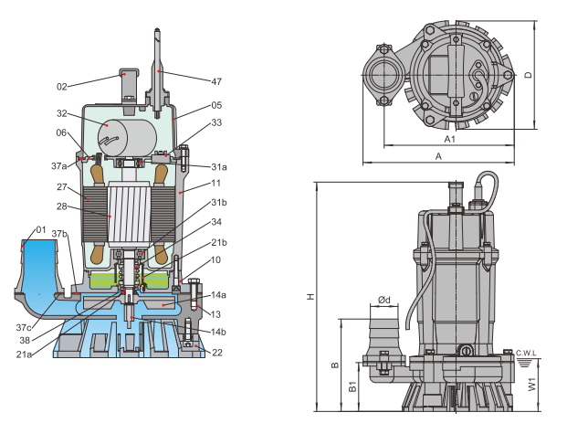 Vật liệu cấu tạo: Buồng bơm, cánh bơm bằng gang đúc (FC250), Trục SS420, có phao