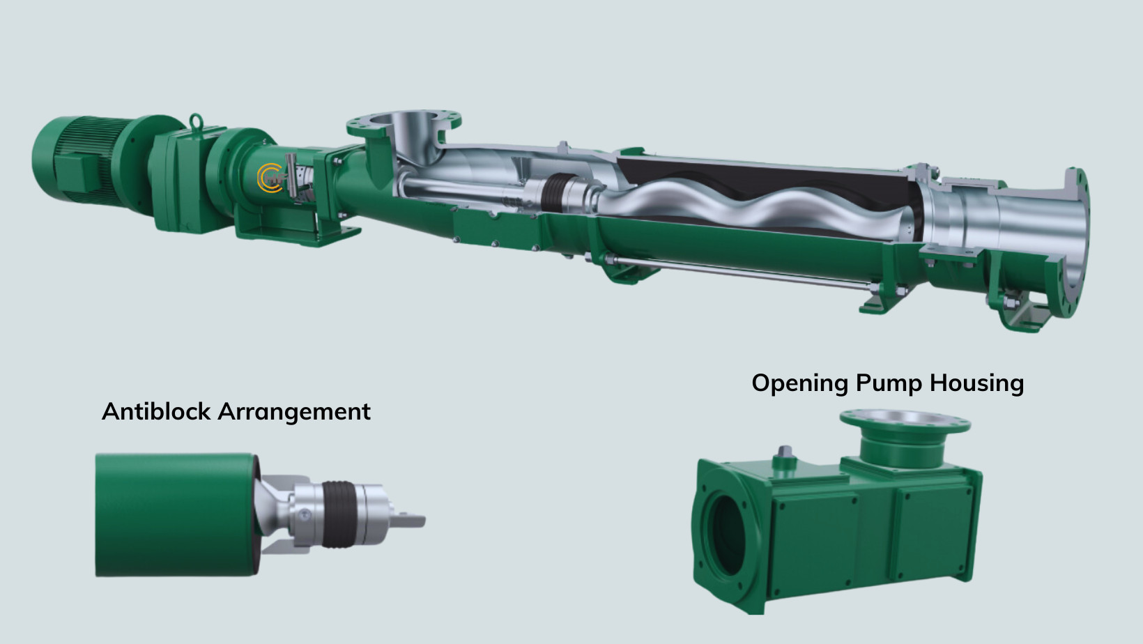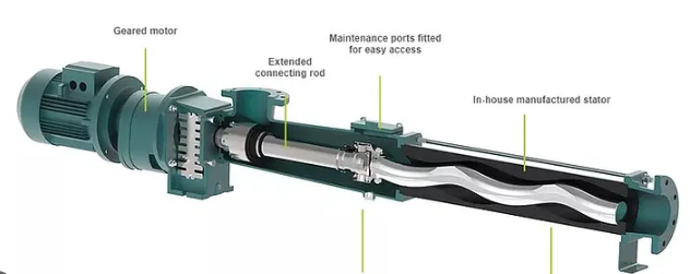 Bên trong stato (có thể so sánh với vít khởi động kép), rôto (có thể so sánh với vít khởi động đơn) di chuyển, đẩy chất lỏng qua các khoang di động được tạo ra bằng chuyển động tịnh tiến. Sản phẩm sau đó được bơm mà không cần cán màng, ly tâm hoặc xử lý sai dưới bất kỳ hình thức nào.
