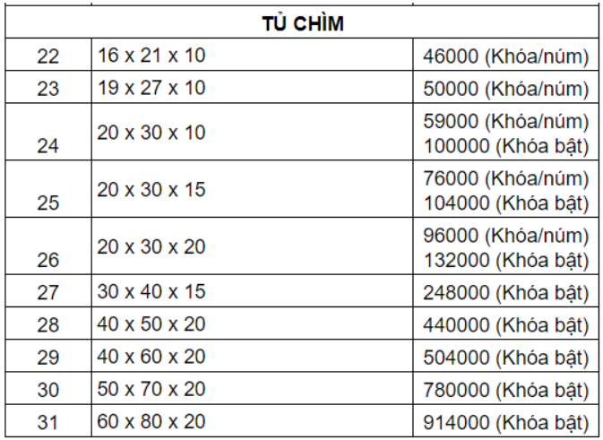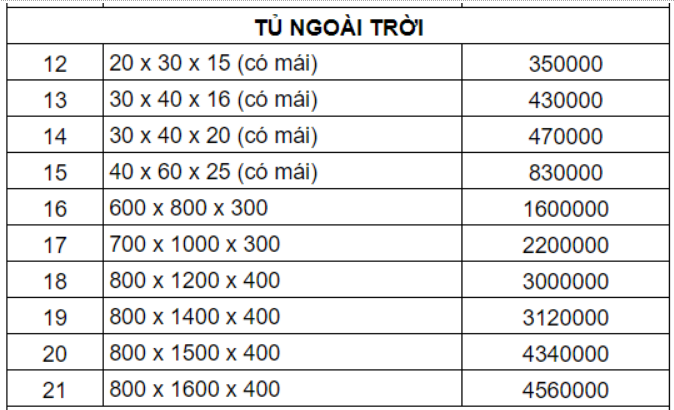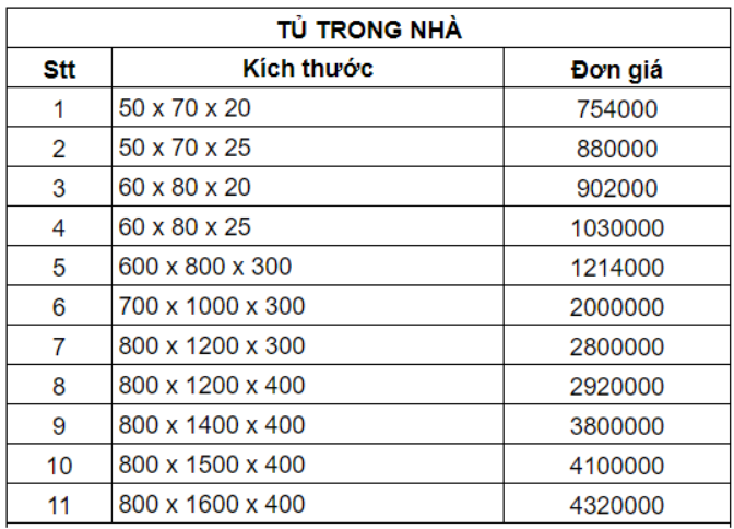 Dựa vào từng ứng dụng thực tế, tủ điện được chia ra thành tủ điện trong nhà, tủ điện ngoài trời, tủ điện chìm. Kích thước từ đó mà cũng có phần khác nhau. Cùng tìm hiểu chi tiết hơn về thông số cùng bảng giá tham khảo nhé.