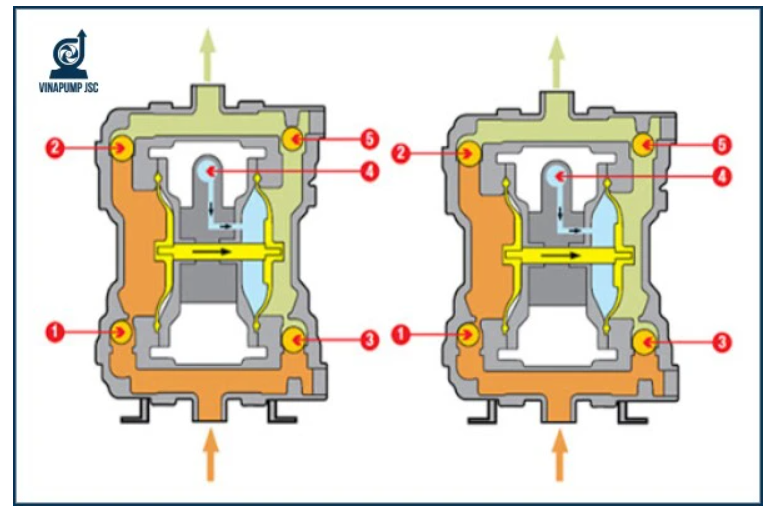 Khí nén tràn vào khoang trong bên trái làm cho màng ngăn đối diện tạo ra lực hút, nâng bi van dưới lên để hút chất lỏng ở đầu vào. Đồng thời, buồng dịch bên trái đang trong chu kỳ “xả”.
