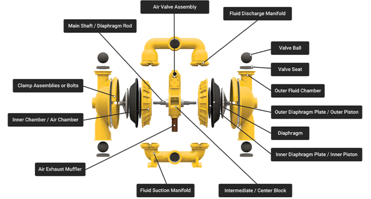 Đây là những bộ phận và thành phần cơ bản của máy bơm AODD: