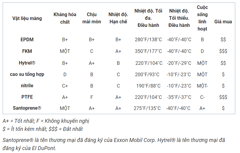 Màng ngăn, bi, vòng đệm và van của máy bơm AODD, còn được gọi là chất đàn hồi , có nhiều loại vật liệu. Việc biết cái nào phù hợp với ứng dụng của bạn phức tạp hơn so với cuộc thảo luận về kim loại và nhựa. Bạn phải tính đến mức giá, nhiệt độ, khả năng tương thích hóa học, độ mài mòn, tuổi thọ uốn và các yếu tố khác.