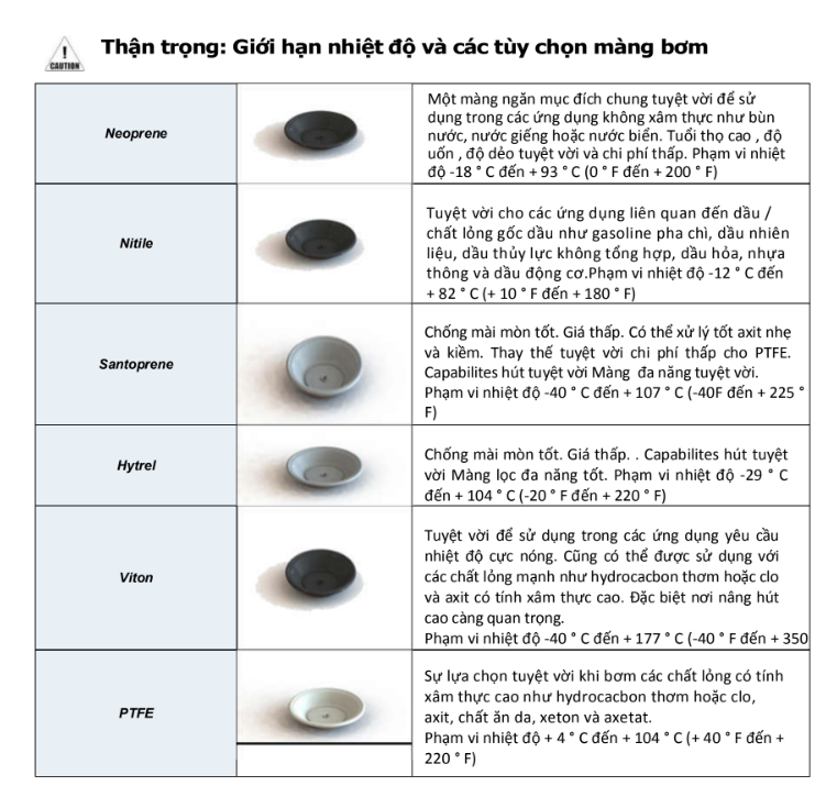 Cần hỗ trợ thực hiện lựa chọn của bạn? Bạn có thể đọc về các đặc tính của vật liệu ở trang 10 của danh mục Đa năng hoặc tham khảo Hướng dẫn lựa chọn vật liệu bên dưới. Tất nhiên, bạn luôn có thể tham khảo ý kiến của nhà phân phối bơm màng Vinapump được ủy quyền của bạn hoặc một trong các kỹ sư ứng dụng của chúng tôi .