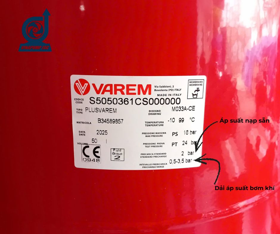 Ví dụ: Nếu máy bơm của bạn cài đặt đóng ngắt ở P min = 2.2 Bar và P max = 3.5 Bar, thì áp suất khí lý tưởng nên là 2.2 - 0.2 = 2.0 Bar.