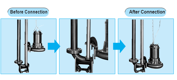 Một trong những lý do khiến máy bơm chìm ShinMaywa được ưa chuộng là thiết bị khớp nối tự động. Lợi ích của Khớp nối nhanh Bơm chìm nước thải Shimaywa: Khi máy bơm được hạ xuống dọc theo đường ống dẫn hướng, máy bơm được kết nối với ống xả thông qua bộ khớp nối tự động và có thể được đưa ra khỏi hố bơm chỉ bằng cách nhấc nó lên. Khớp nối này tạo điều kiện thuận lợi cho việc bảo trì, dễ dàng nâng máy bơm lên, đưa cặn nước thải ra ngoài hoặc giúp siết chặt - nới lỏng bu lông.
