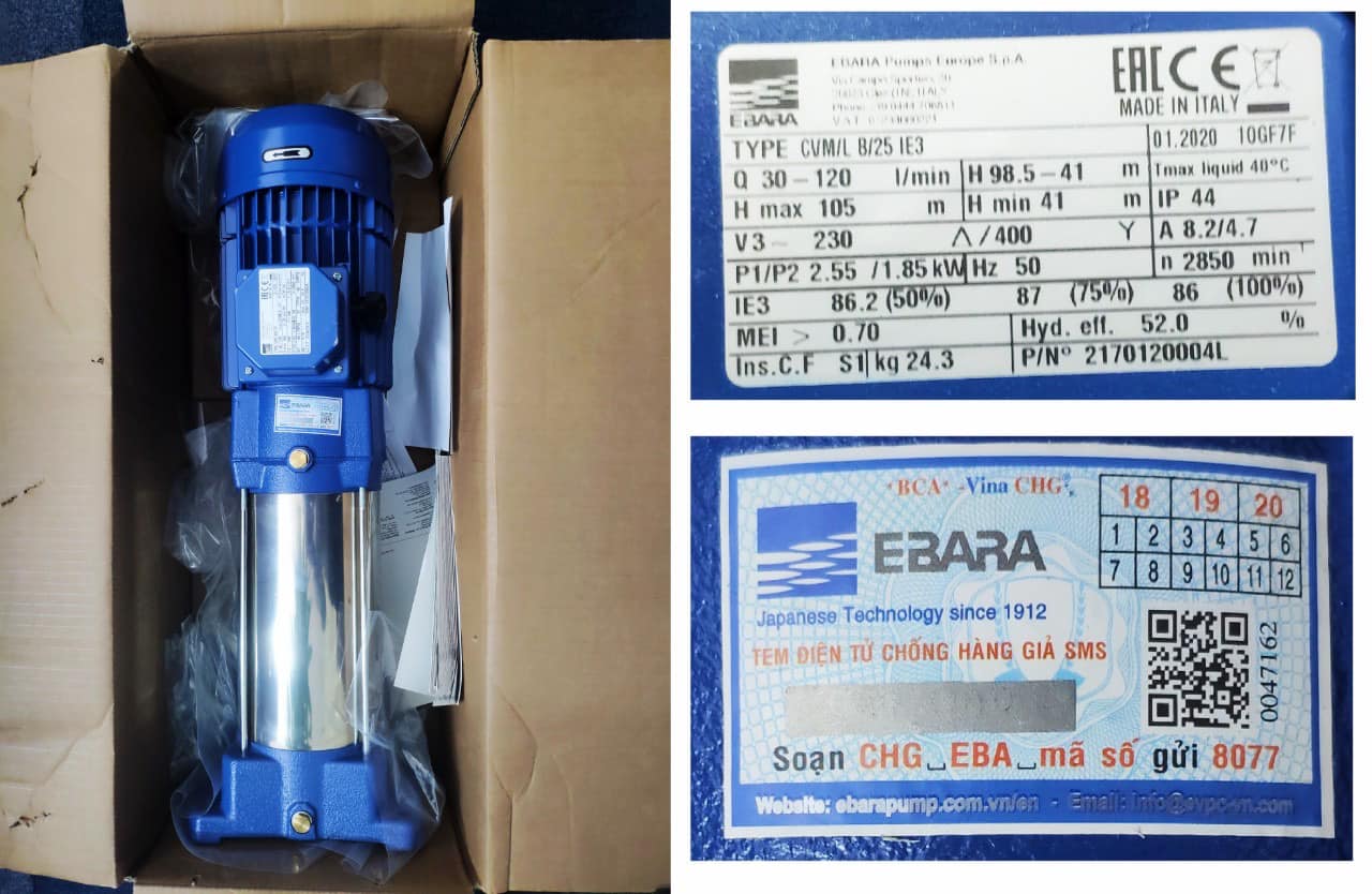 Tất cả sản phẩm máy bơm ebara đều được dãn tem chống giả của nhà nhập khẩu. Và được kiểm soát bởi mã cào trên tem và kiểm tra trên tổng đài được in trên tem chống hàng giả