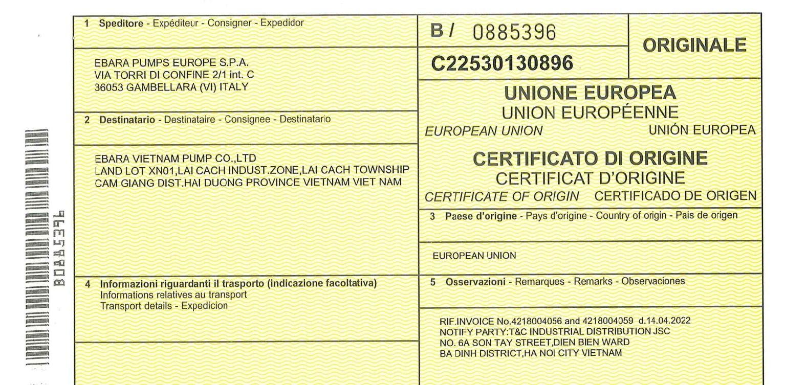 Giấy tờ nguồn gốc xuất xứ chứng chỉ chất lượng (CO, CQ) bản sao bởi nhà nhập khẩu đóng dấu.