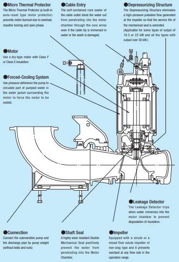 Bơm chìm nước thải Shimaywa Series CN là loại máy bơm chìm được thiết kế với kiểu cánh non-clog giúp đẩy cặn rác khỏi cánh bơm, chống tắc nghẽn, Bơm còn được trang bị hệ thống tuần hoàn làm mát cưỡng bức: một phần nước được bơm trong lớp áo bao quanh động cơ, giúp làm mát động cơ, ổn định nhiệt độ hoạt động của bơm.