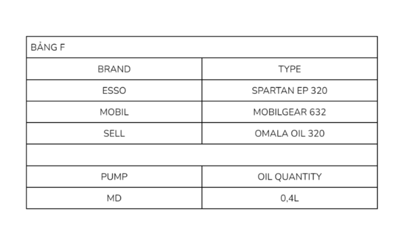 Bảng dầu tra và thể tích dầu máy bơm định lượng
