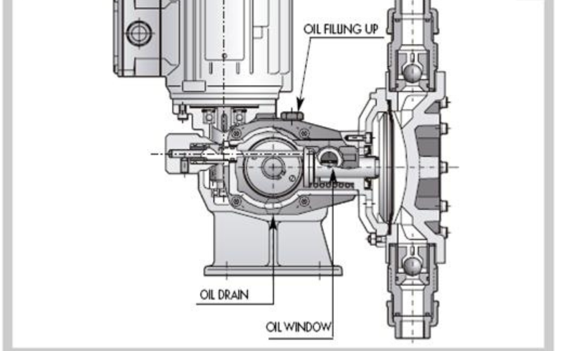 Vị trí tra dầu, xả dầu, cửa sổ quan sát của bơm định lượng được mô tả trên ảnh:
